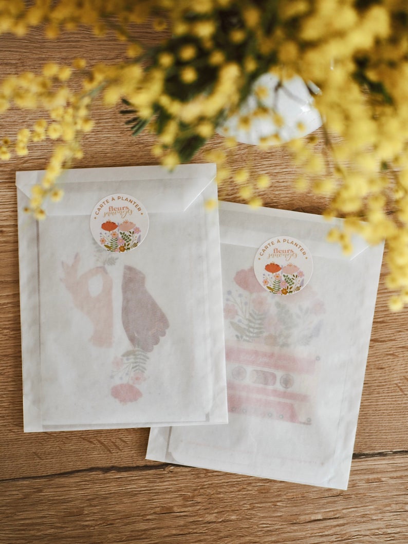 La carte à planter, la carte explicative et l'enveloppe sont emballées dans un sachet en papier crystal (respectueux de l'environnement) et toujours accompagnées d'une carte de remerciement. ♥